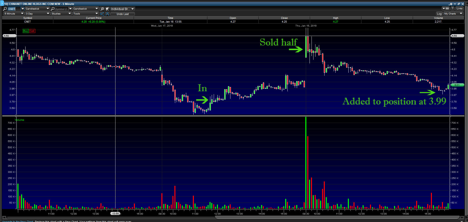 Remember CNET? It rallied on January 4 when it gapped up from 1.23 and rocketed to a whopping 11.90. Trader Scott mentioned in the pre-market comments in the morning that very day BTW. Hopefully, some of you listened and bought it and sold it. Regretfully, I did not trade it as I had my attention on other symbols, but since then I have been looking to make up for that lost opportunity. I found it yesterday as I got into the stock at 3.83; it had taken quite a little tumble on share offering news which is typical.